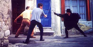Below: a brief workout and fencing practice with two musketeers! Better luck next time Amigos! Right: French girls like to fight too!
